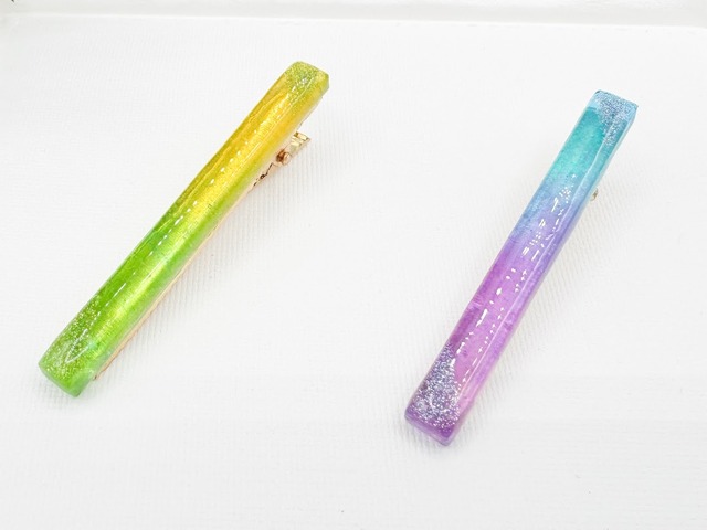空の色を閉じ込めたような、透明感とゆらめき。 レジンの中に浮かぶグラデーションが、一点物の異なる表情を見せるヘアアクセサリーです。 まるで雲の切れ間からこぼれたひとかけらの空を、 そっと紙にとめるような感覚。 シンプルな装いにも、人さじの彩をそえて。 気分に合わせてお選びいただけます。 サイズ 6.5㎝ x 0.7㎝