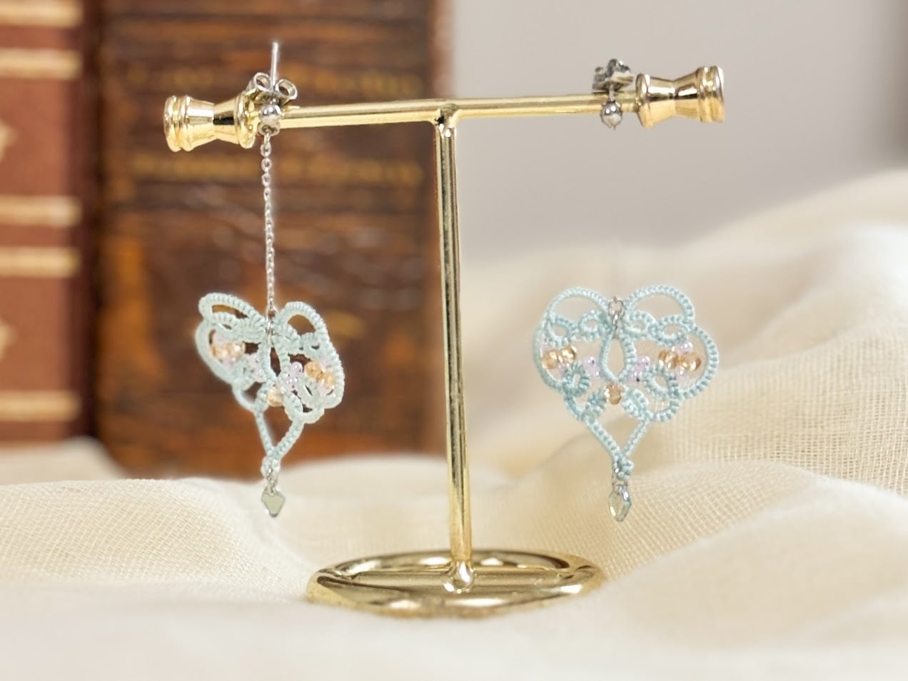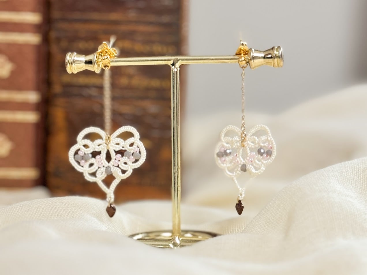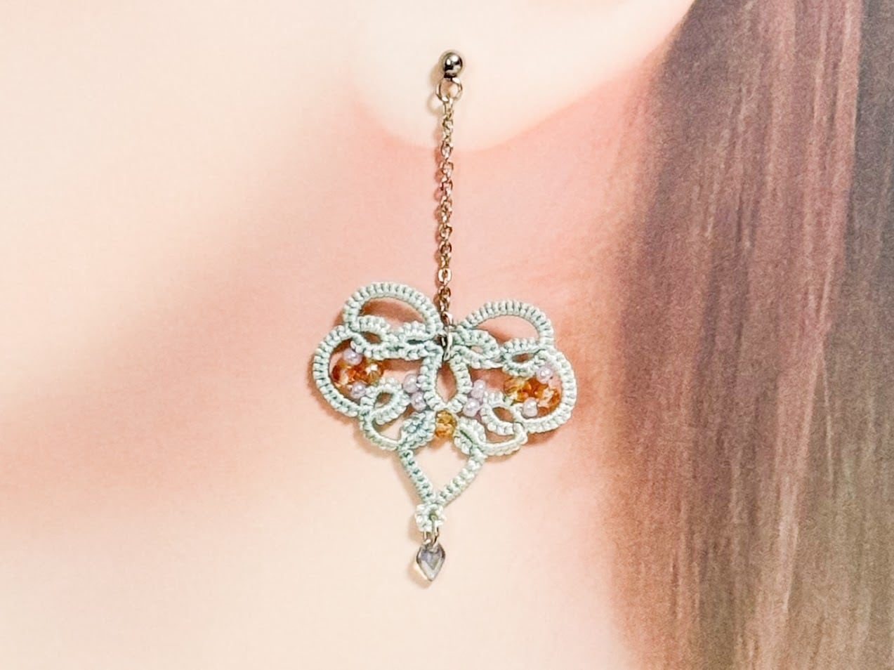 繊細なタティングレースとクリスタルがそっと揺れるアクセサリー。