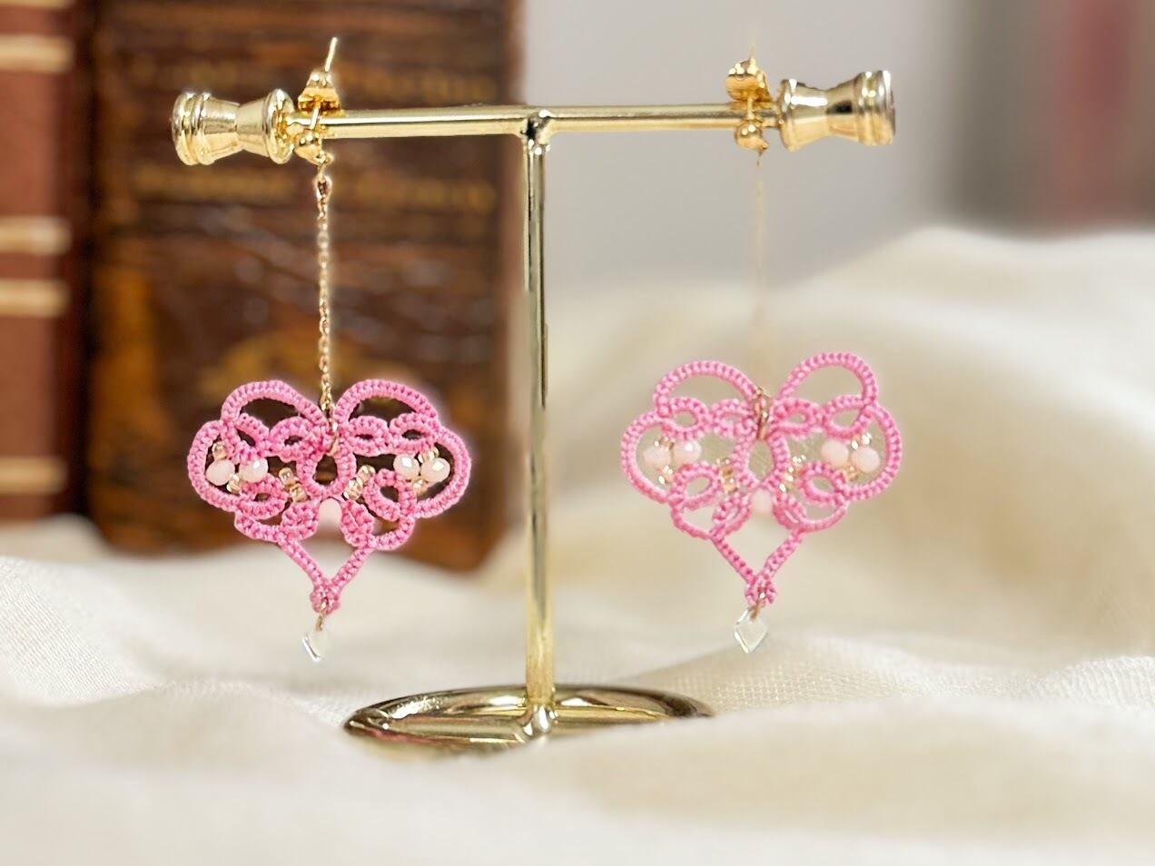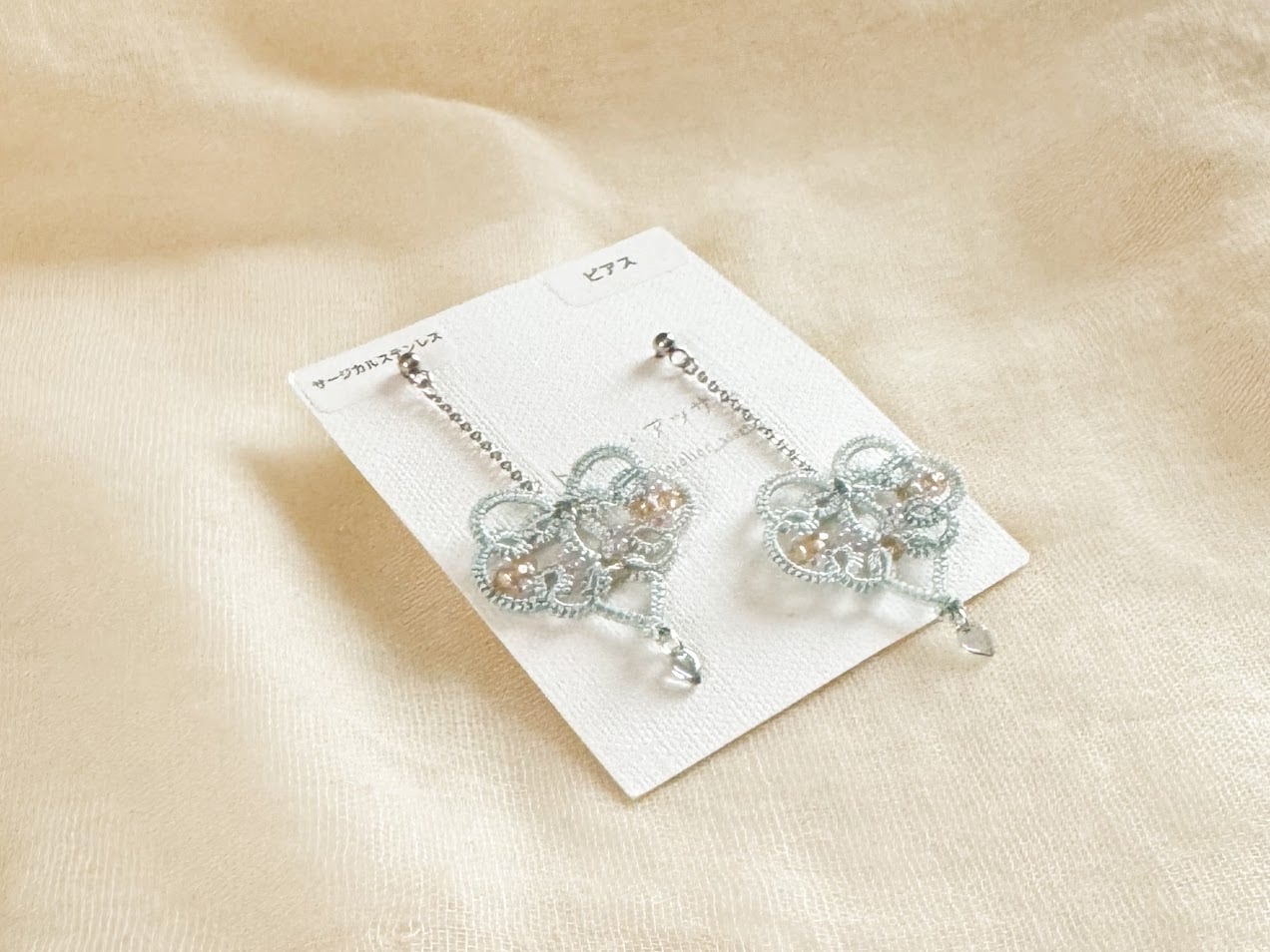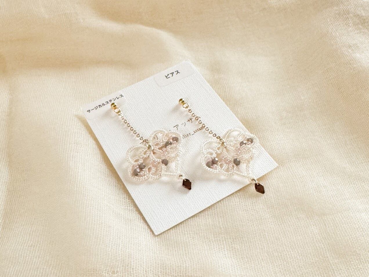 繊細なタティングレースとクリスタルがそっと揺れるアクセサリー。
