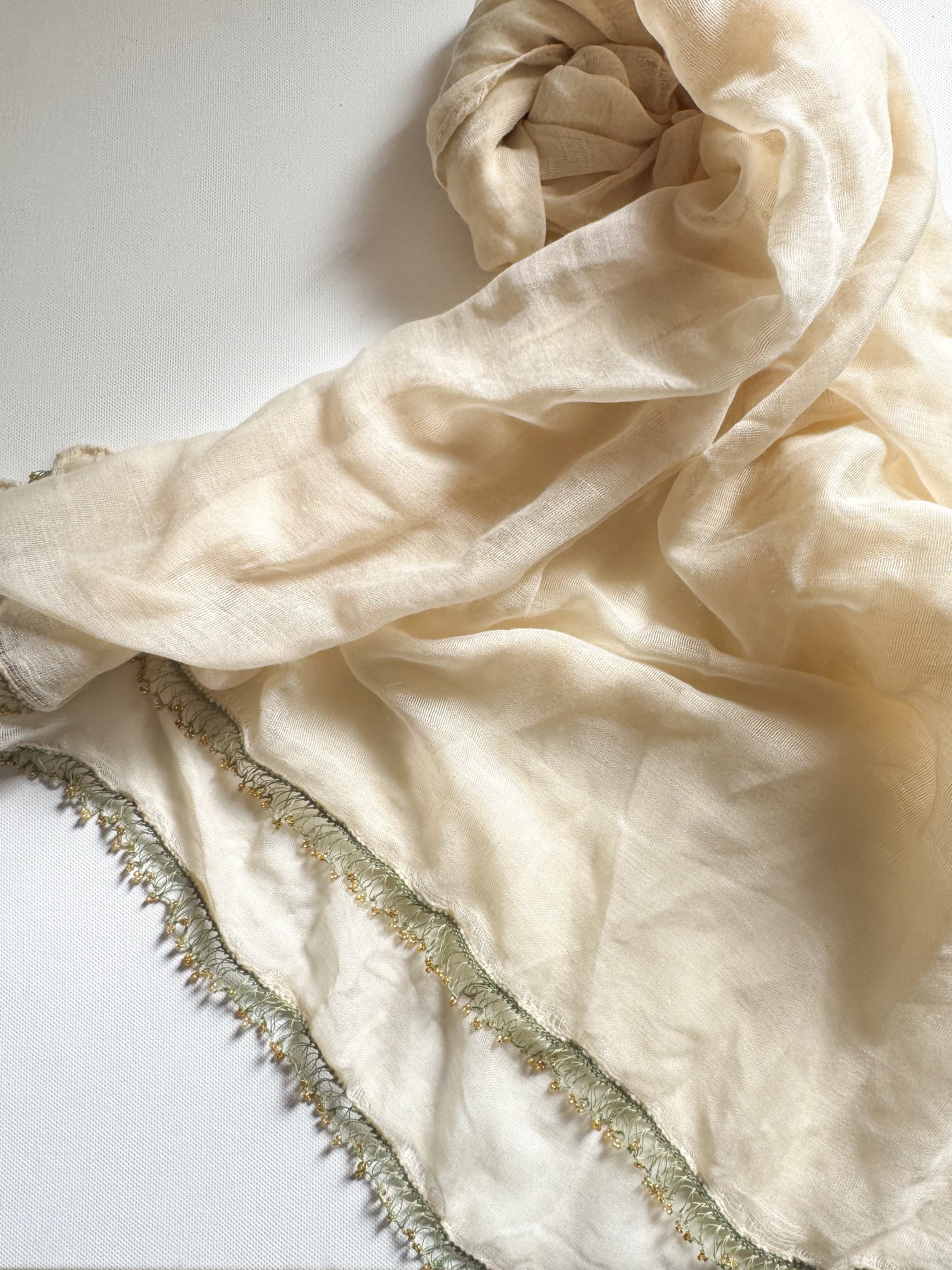 柔らかなガーゼ素材に、トルコの糸と小さなビーズで縁編みを施したストールです。
