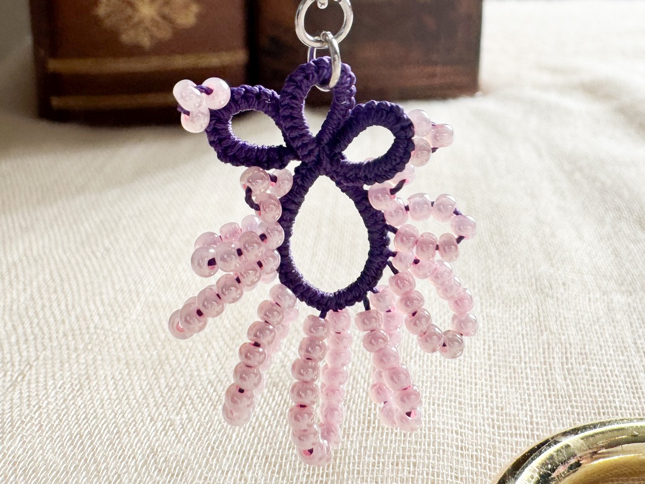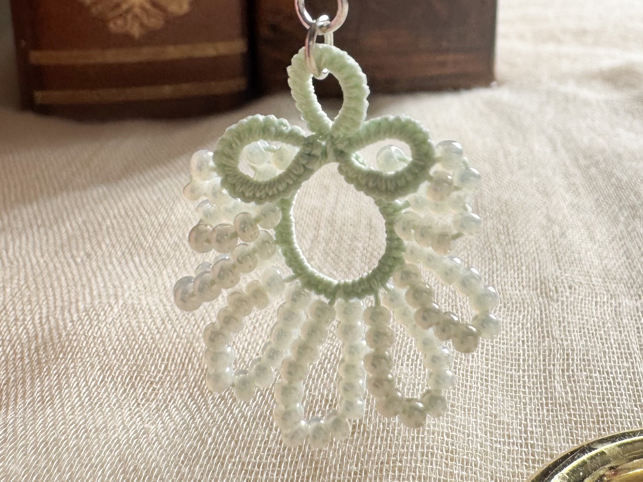 マットカラーの糸を使い繊細なタティングレースで結い上げた、
